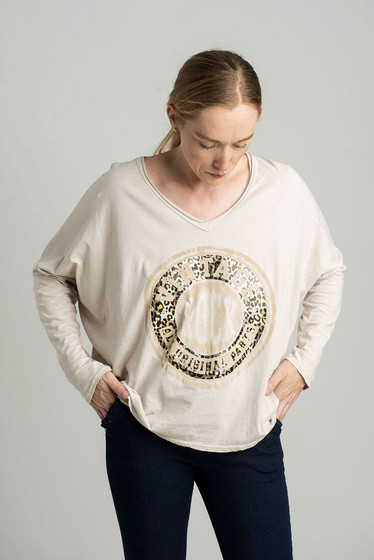 Beżowa bluzka oversize z błyszczącym nadrukiem