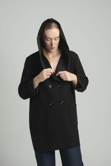 Czarny dwurzędowy płaszcz z kapturem