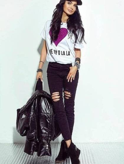 Czarna bluzka z nadrukiem zamek koronka By o la la