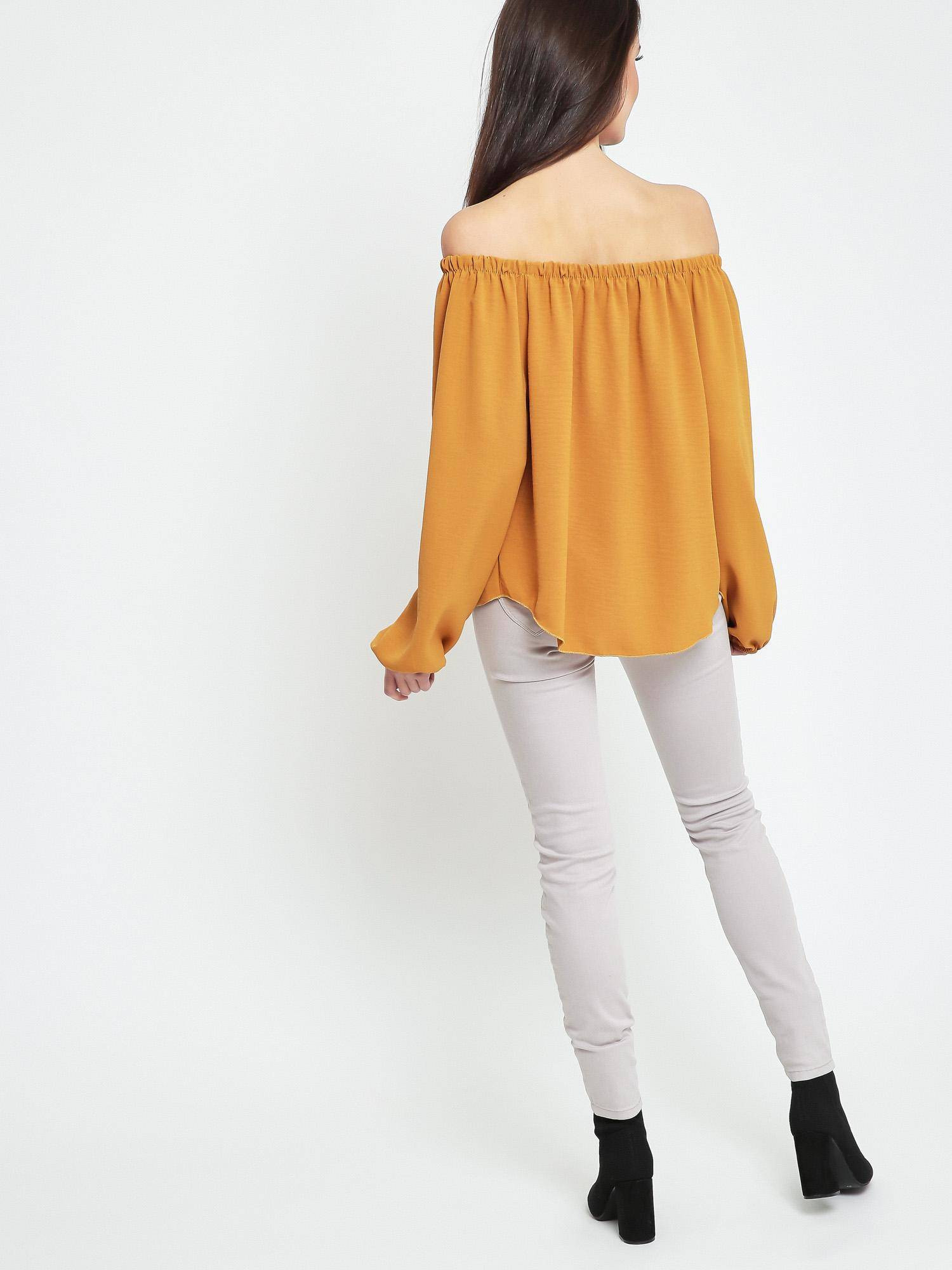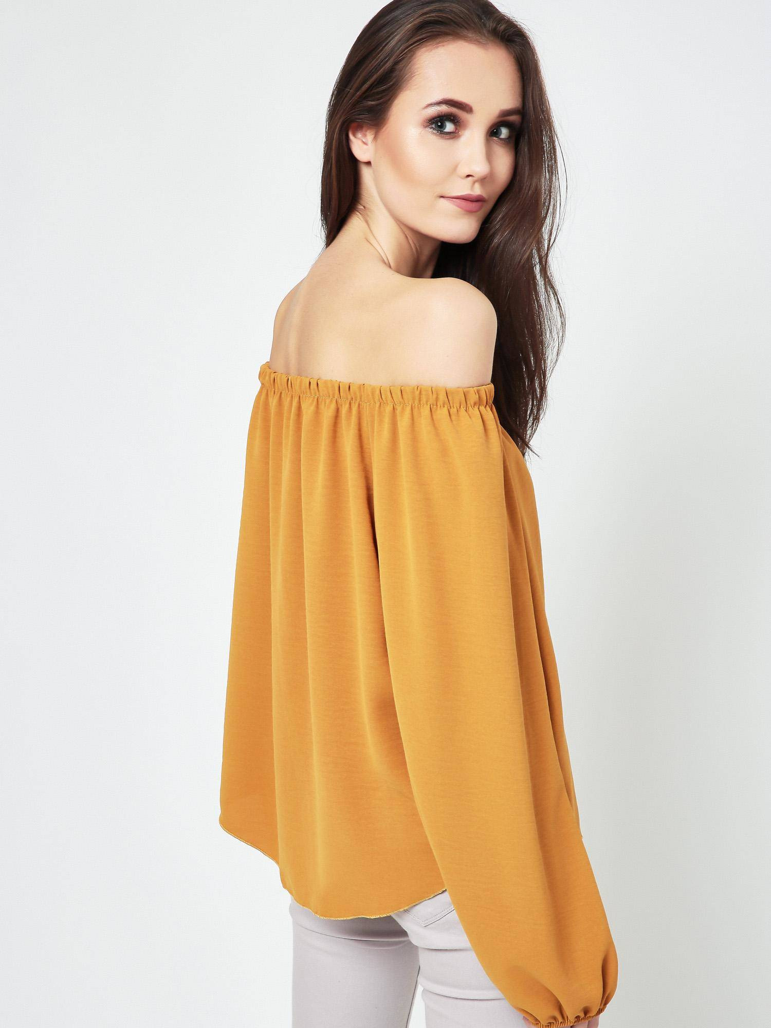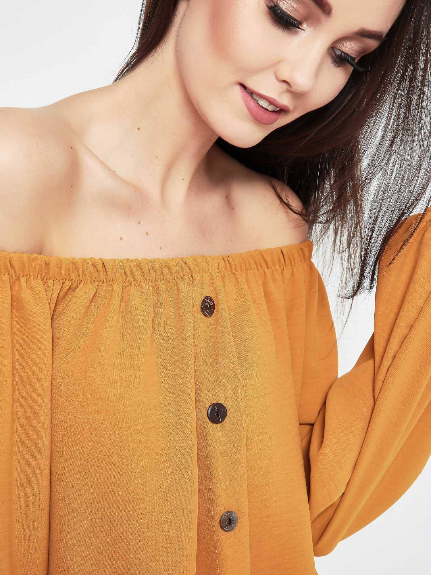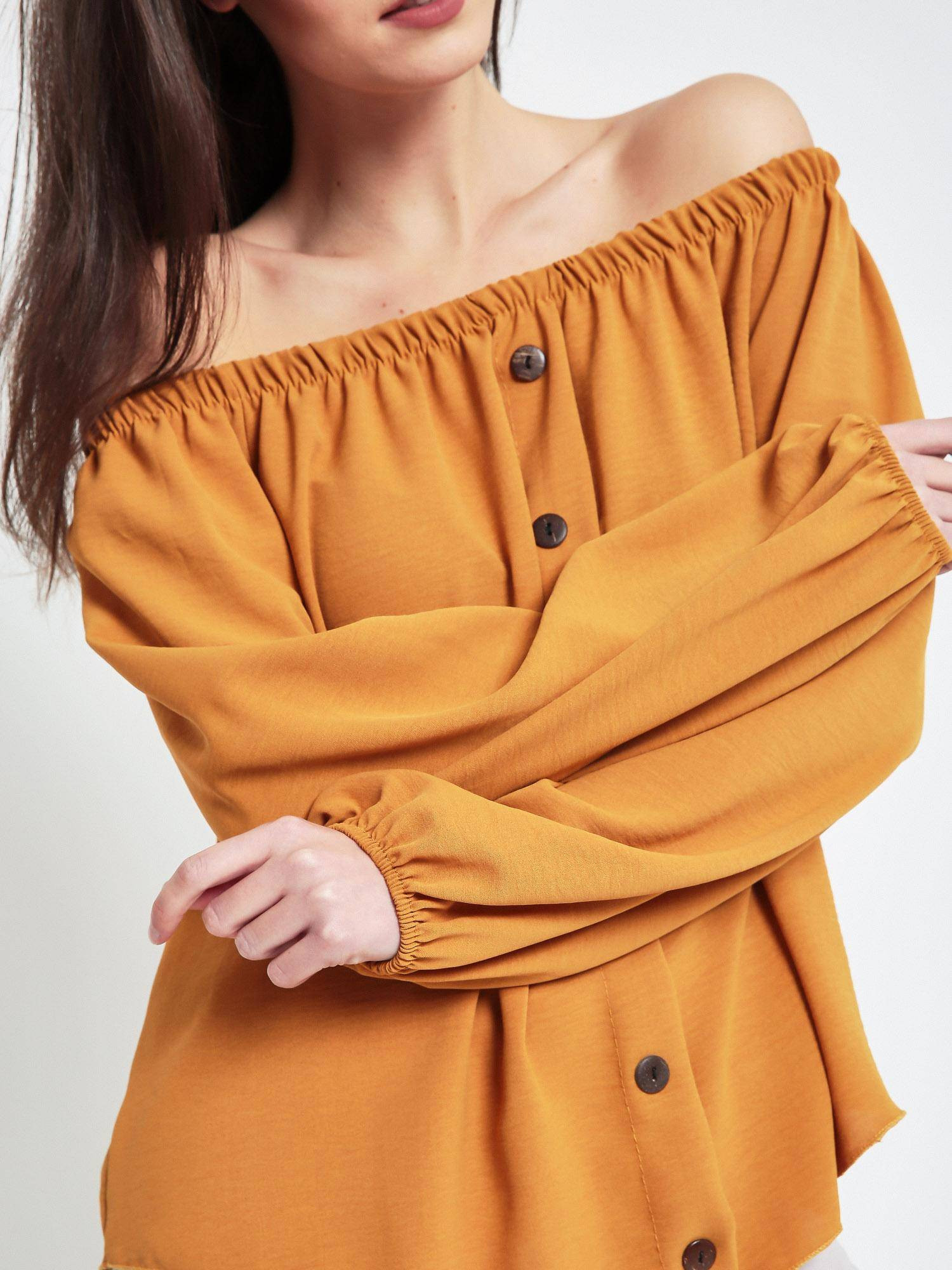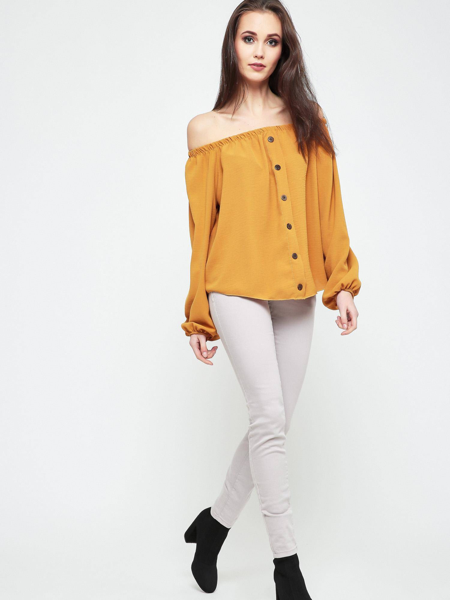 Wykonana z jednolitej tkaniny bluzka o swobodnym kroju zdobiona plisą z guzikami. Model z szerokim dekoltem na gumce.