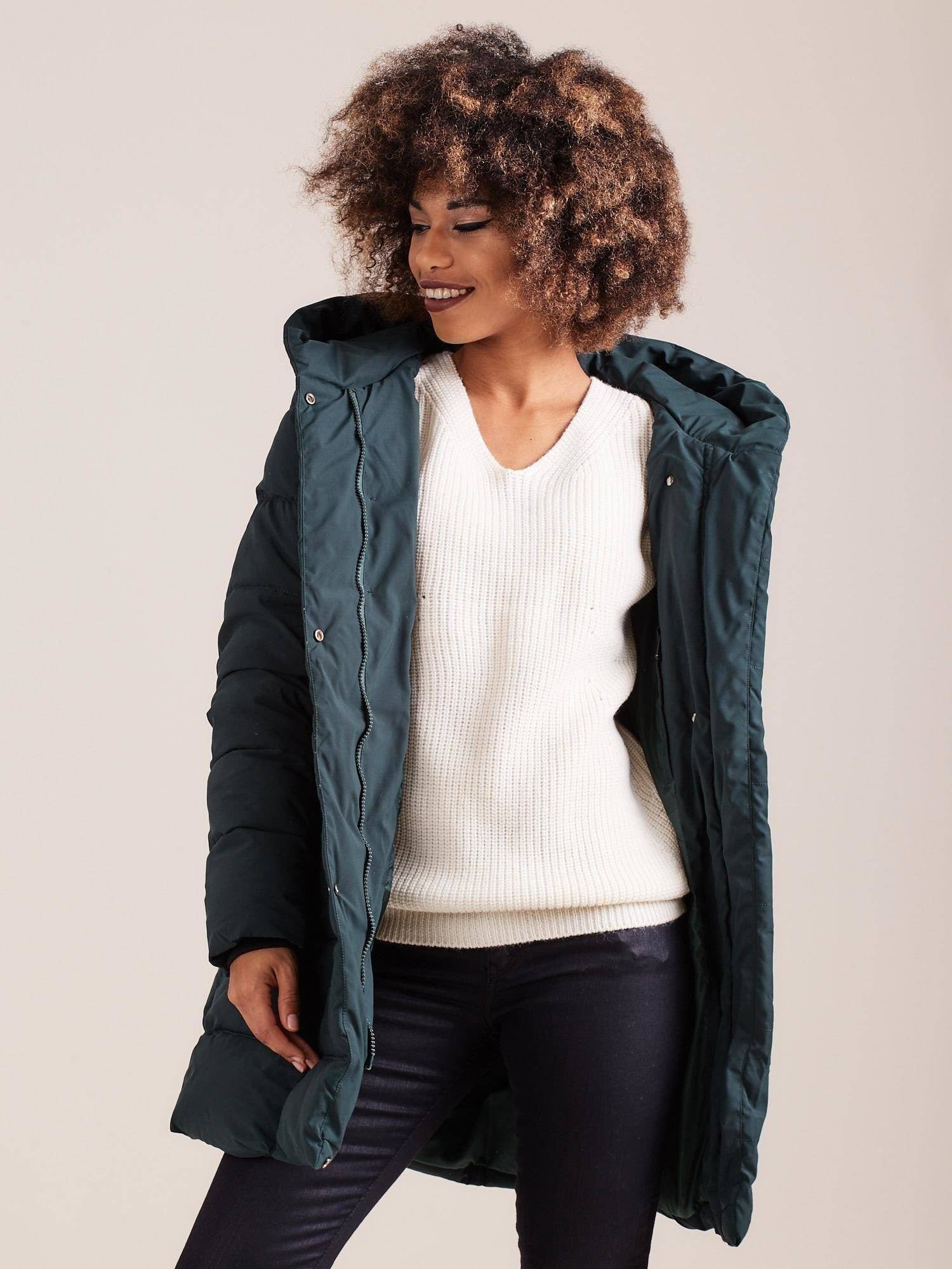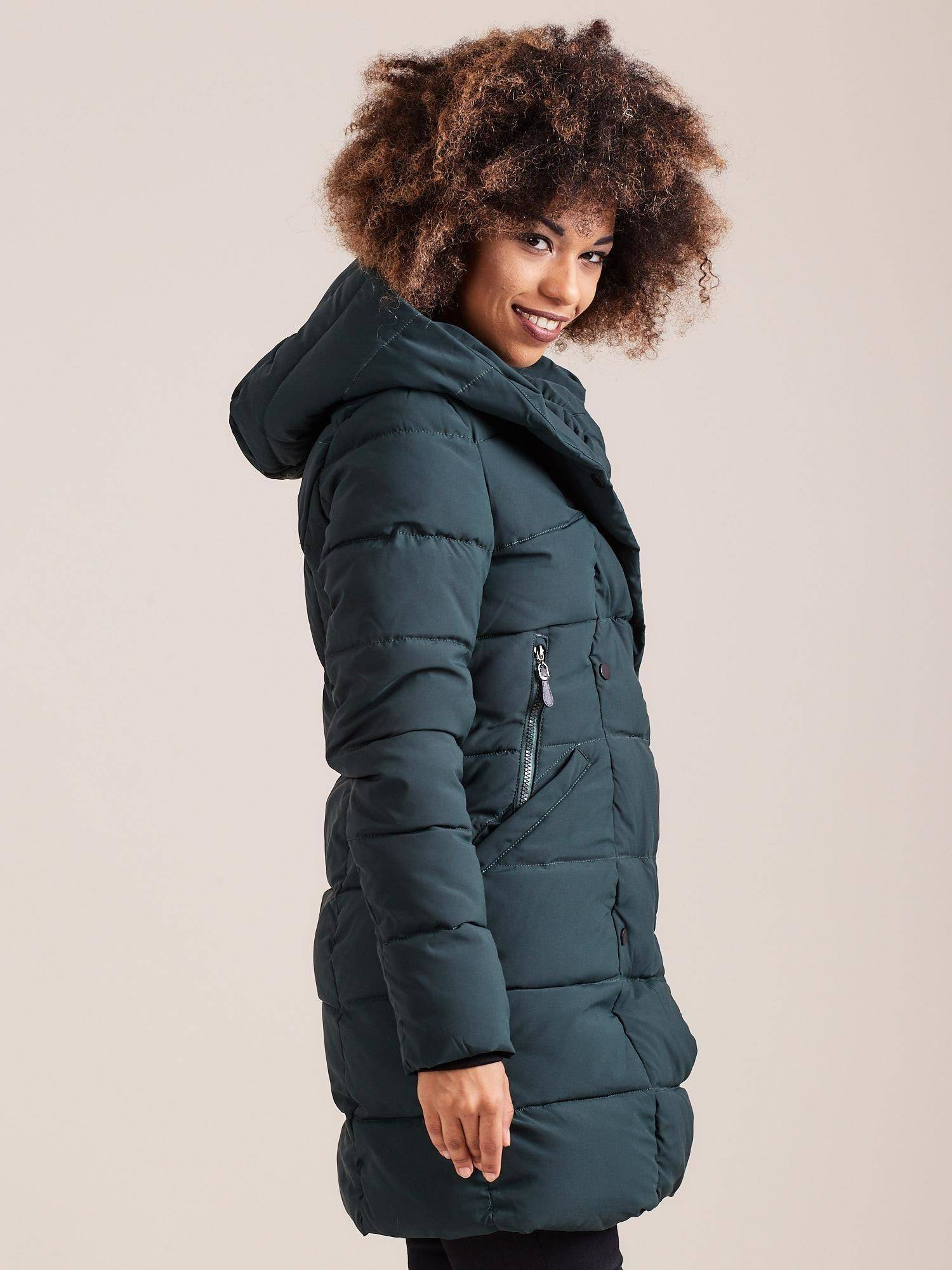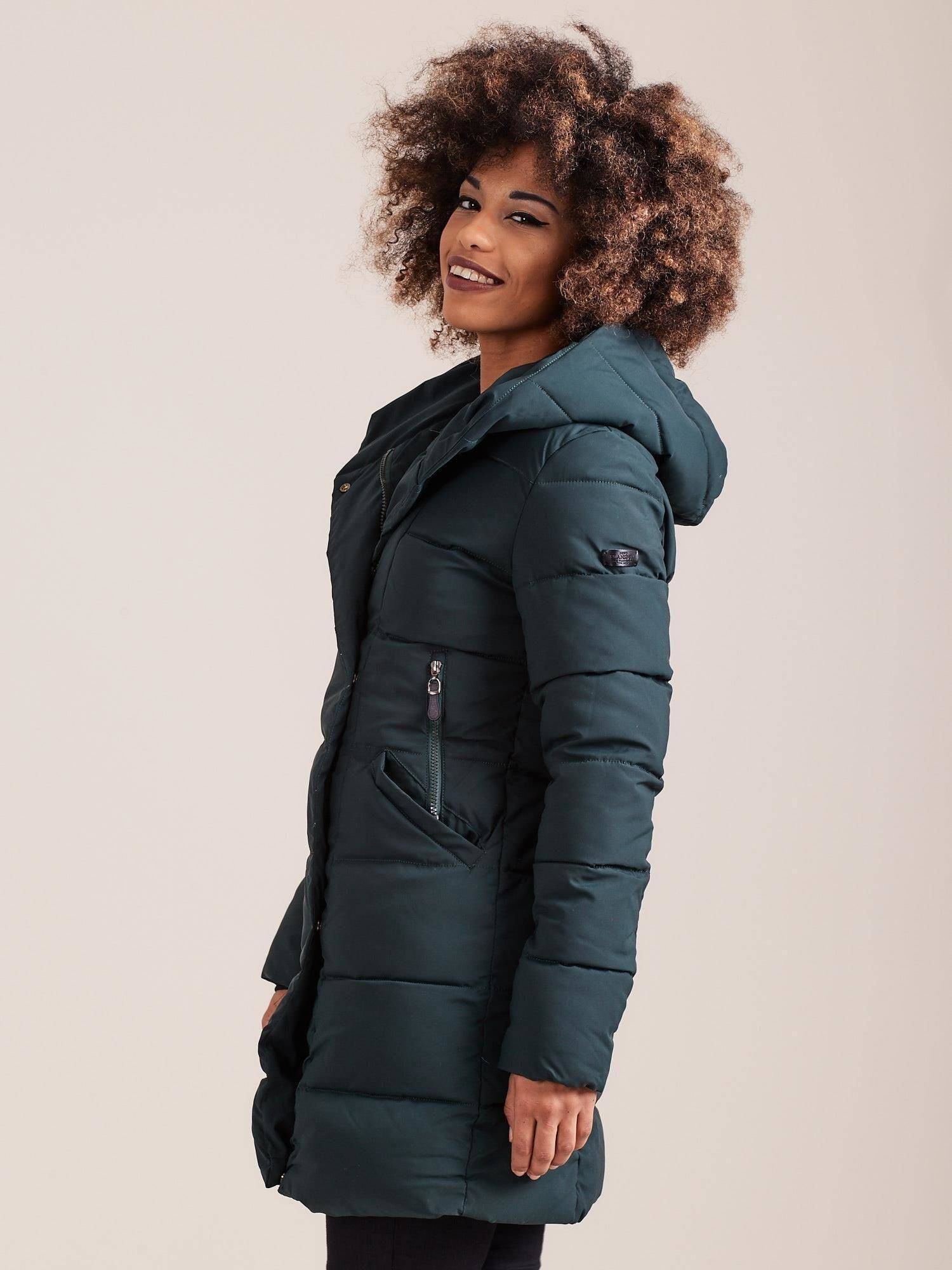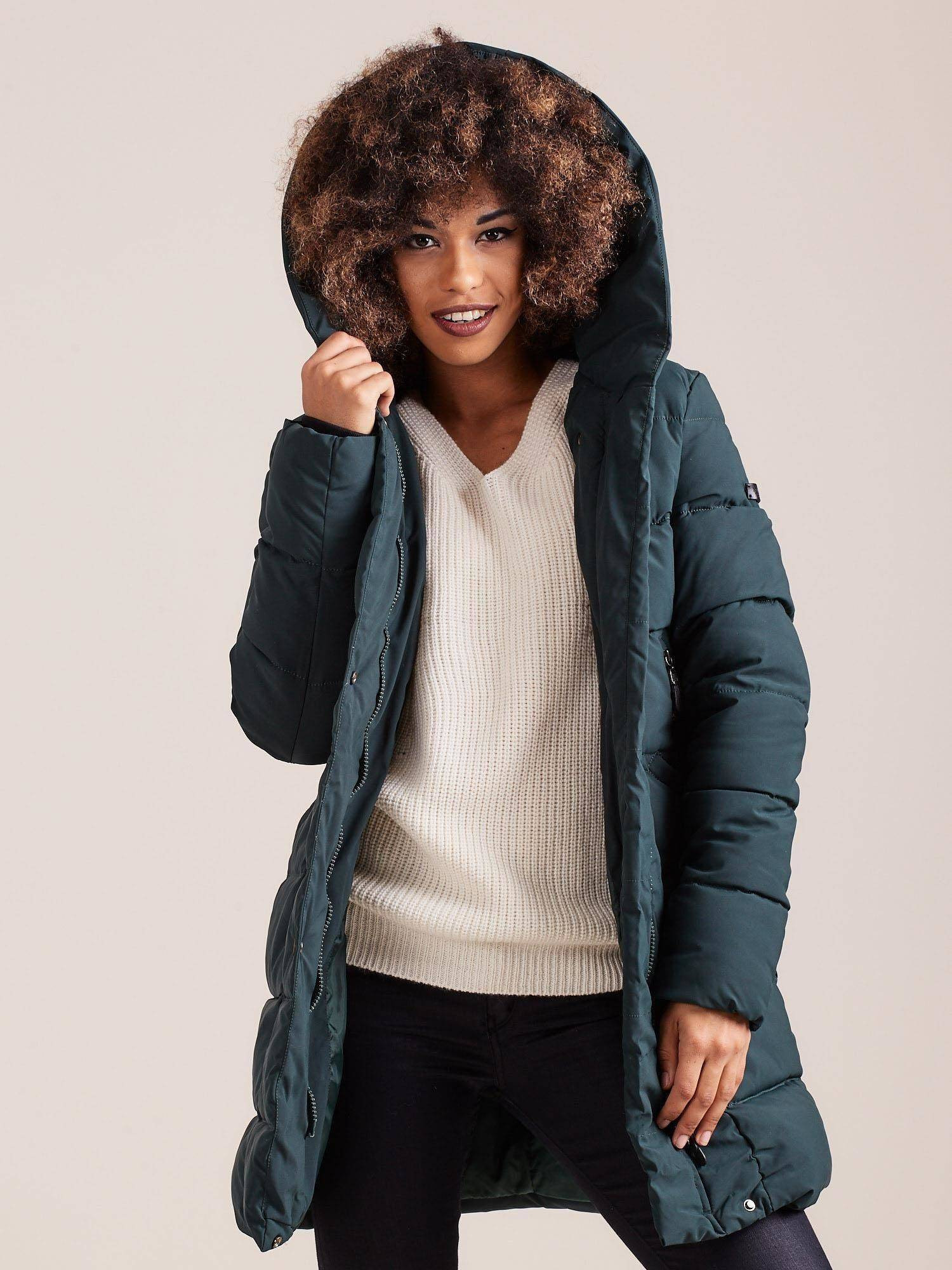 Długa, ciepła kurtka z kapturem z klasycznym zapięciem na zamek i napy. Model slimowany, po bokach posiada kieszenie zapinane na zamek.