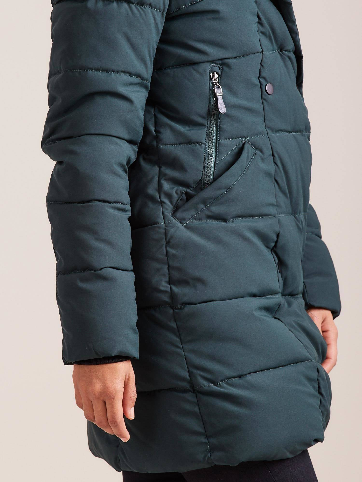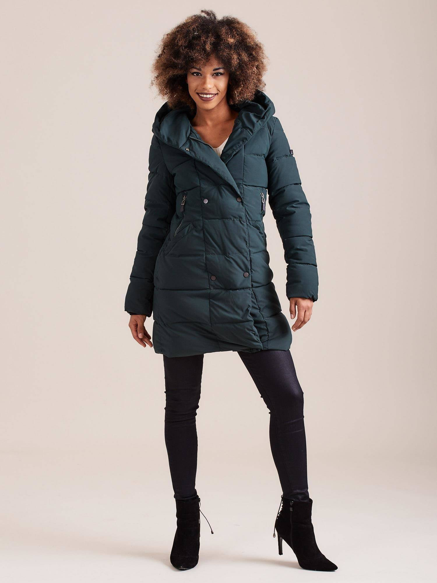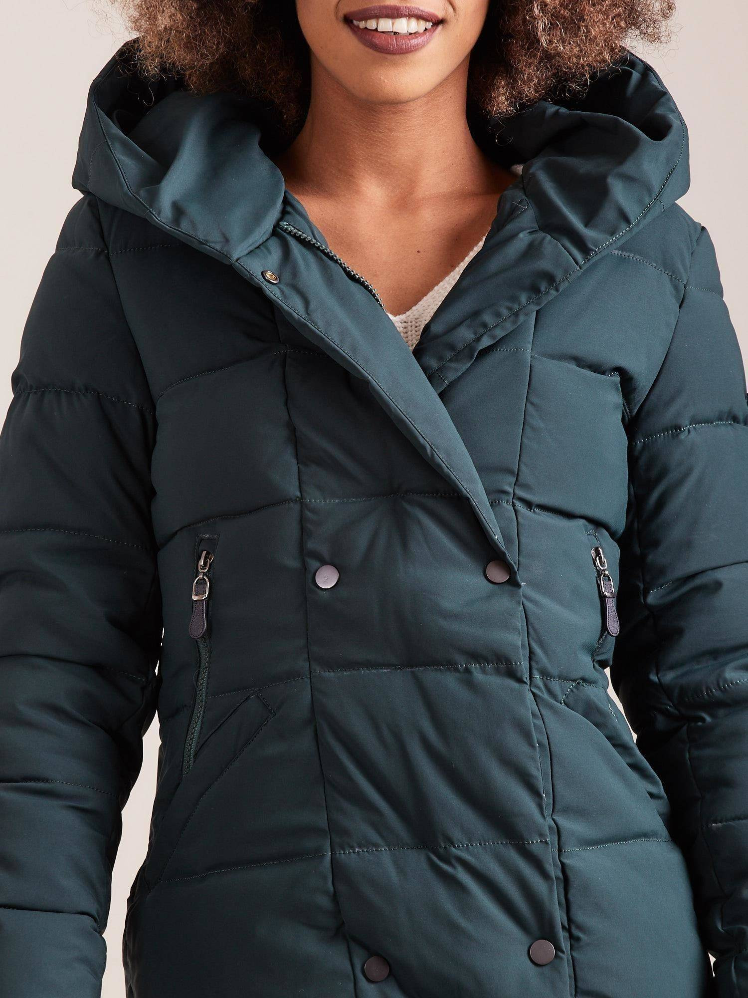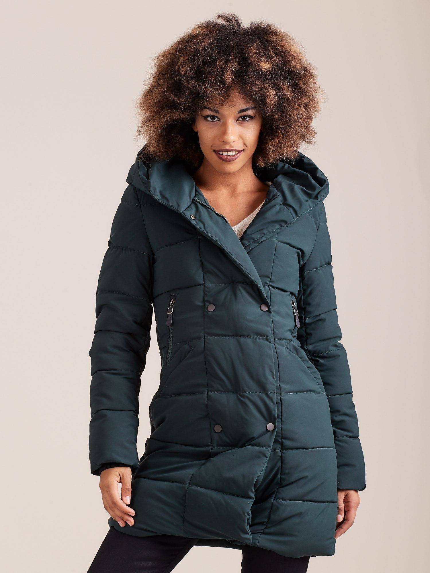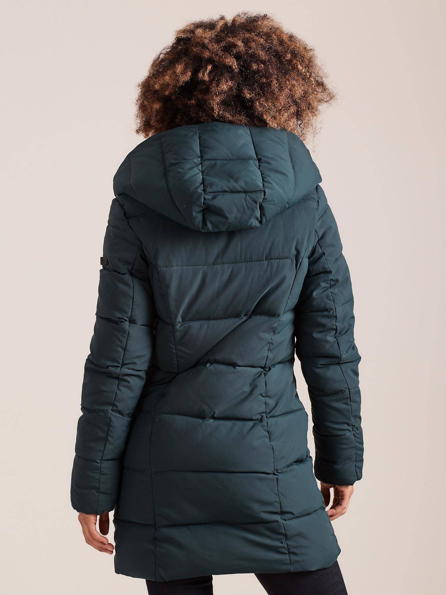 Długa, ciepła kurtka z kapturem z klasycznym zapięciem na zamek i napy. Model slimowany, po bokach posiada kieszenie zapinane na zamek.