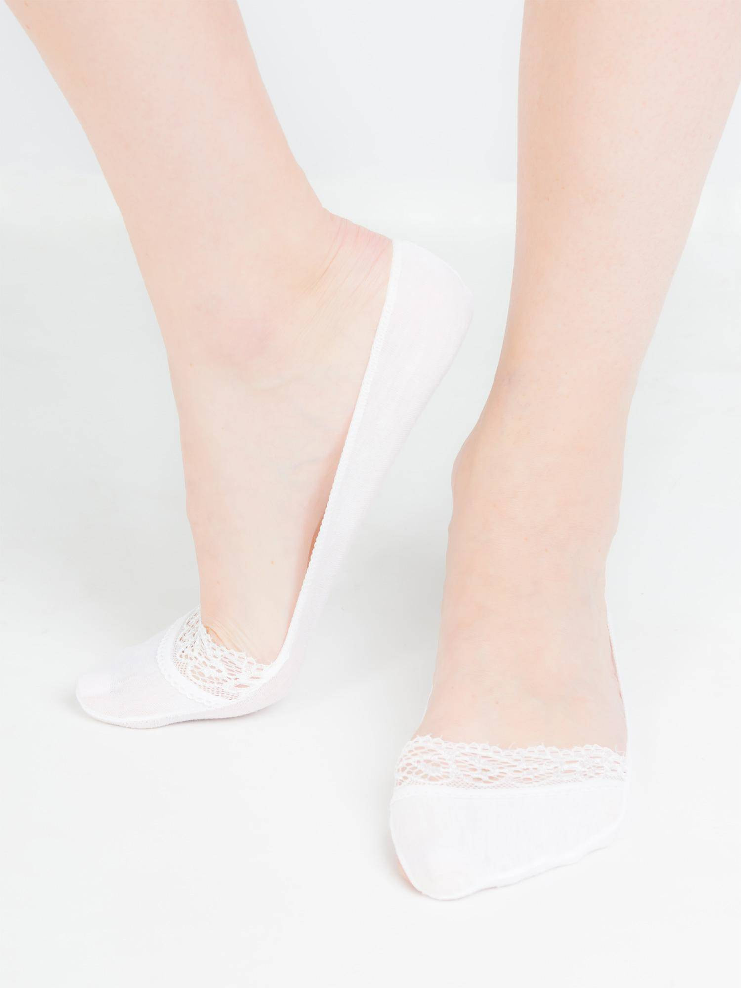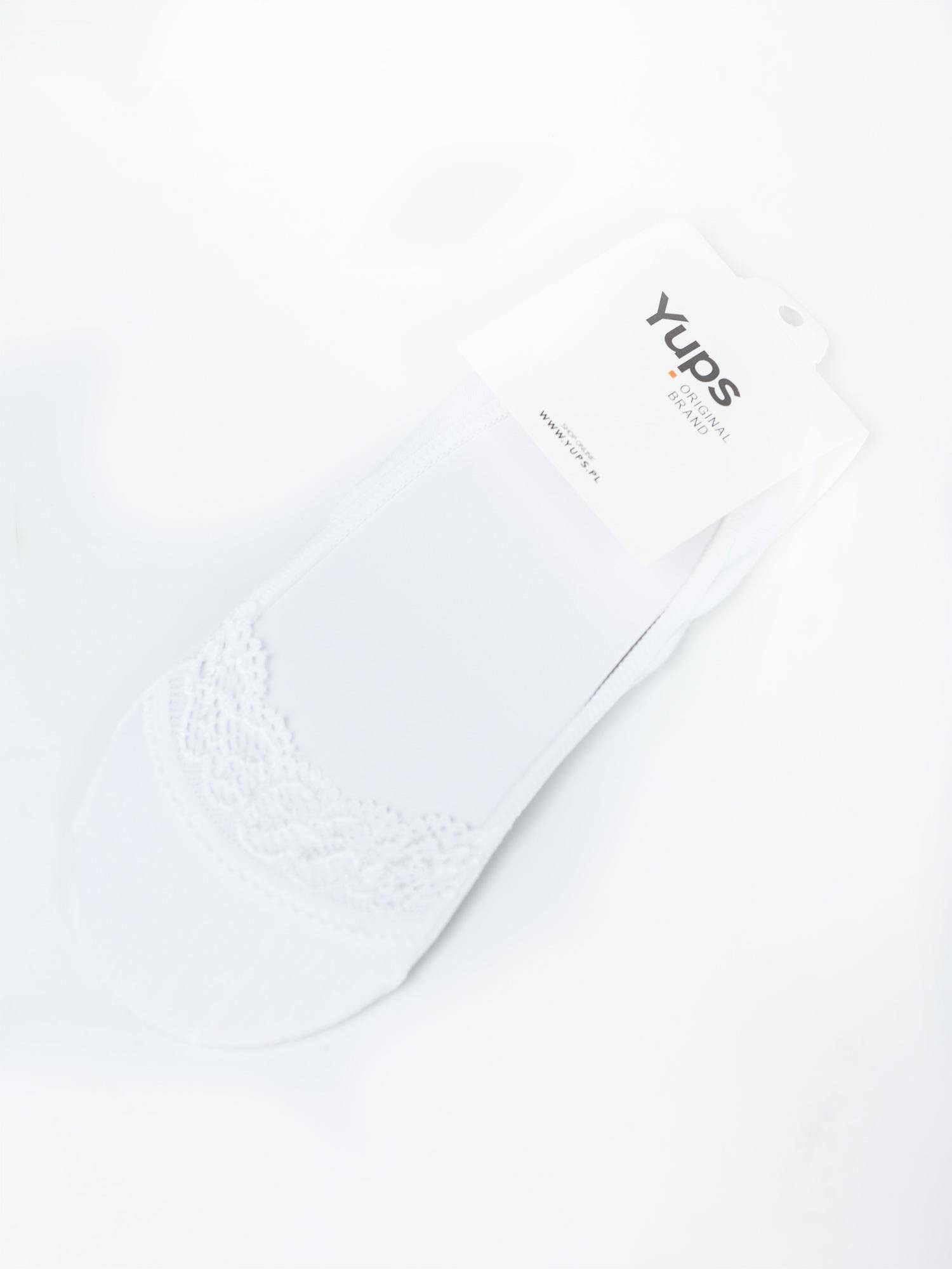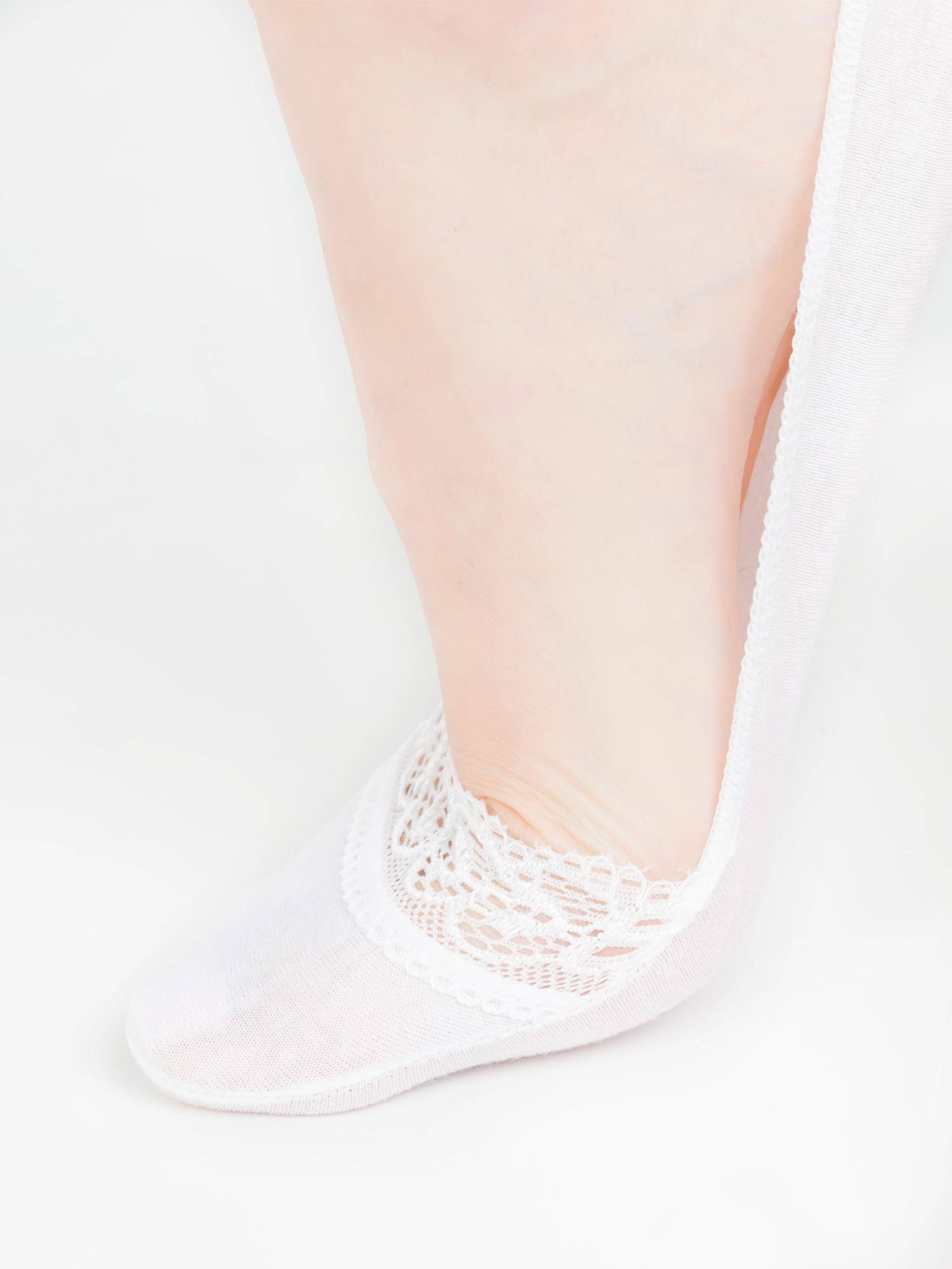 Delikatne białe, stopki zdobione koronkowym paskiem. Uszyte z elastycznego materiału, ładnie przylegają do stopy. Dostępne w rozmiarze uniwersalnym.