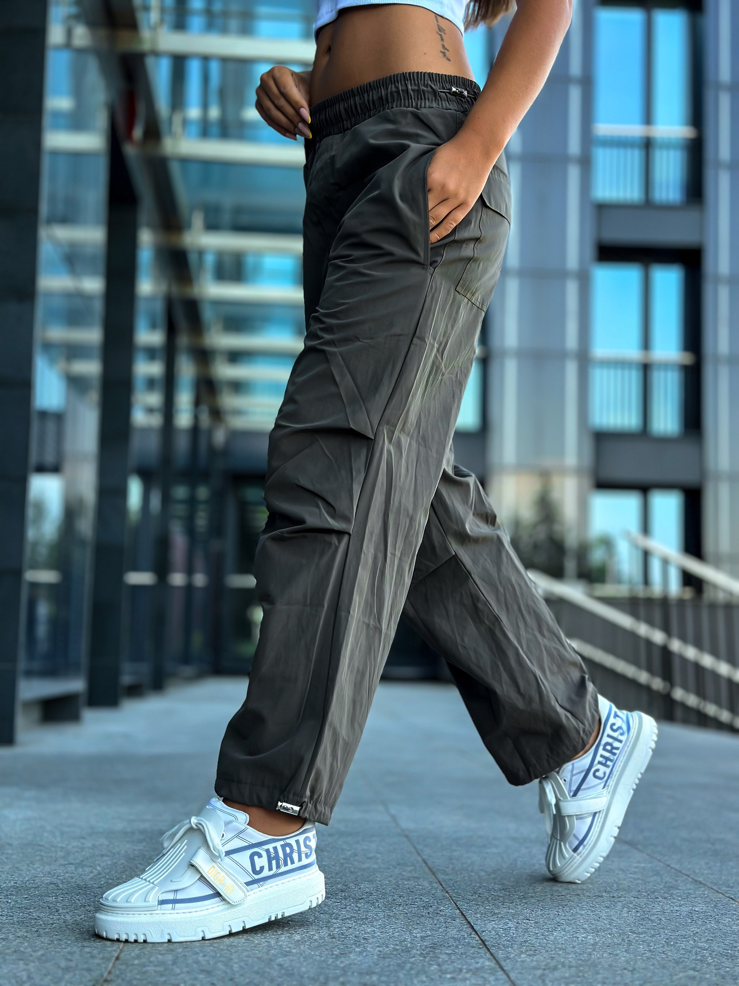 Wyjątkowe spodnie typu parachute wykonane z lekkiej, technicznej tkaniny. Posiadają pas ściągany gumą i trokami po bokach, co umożliwia regulację i dopasowanie do indywidualnych preferencji. Szerokie i luźne nogawki spodni mają możliwość ściągnięcia, co daje większą swobodę w kreowaniu swojego looku.