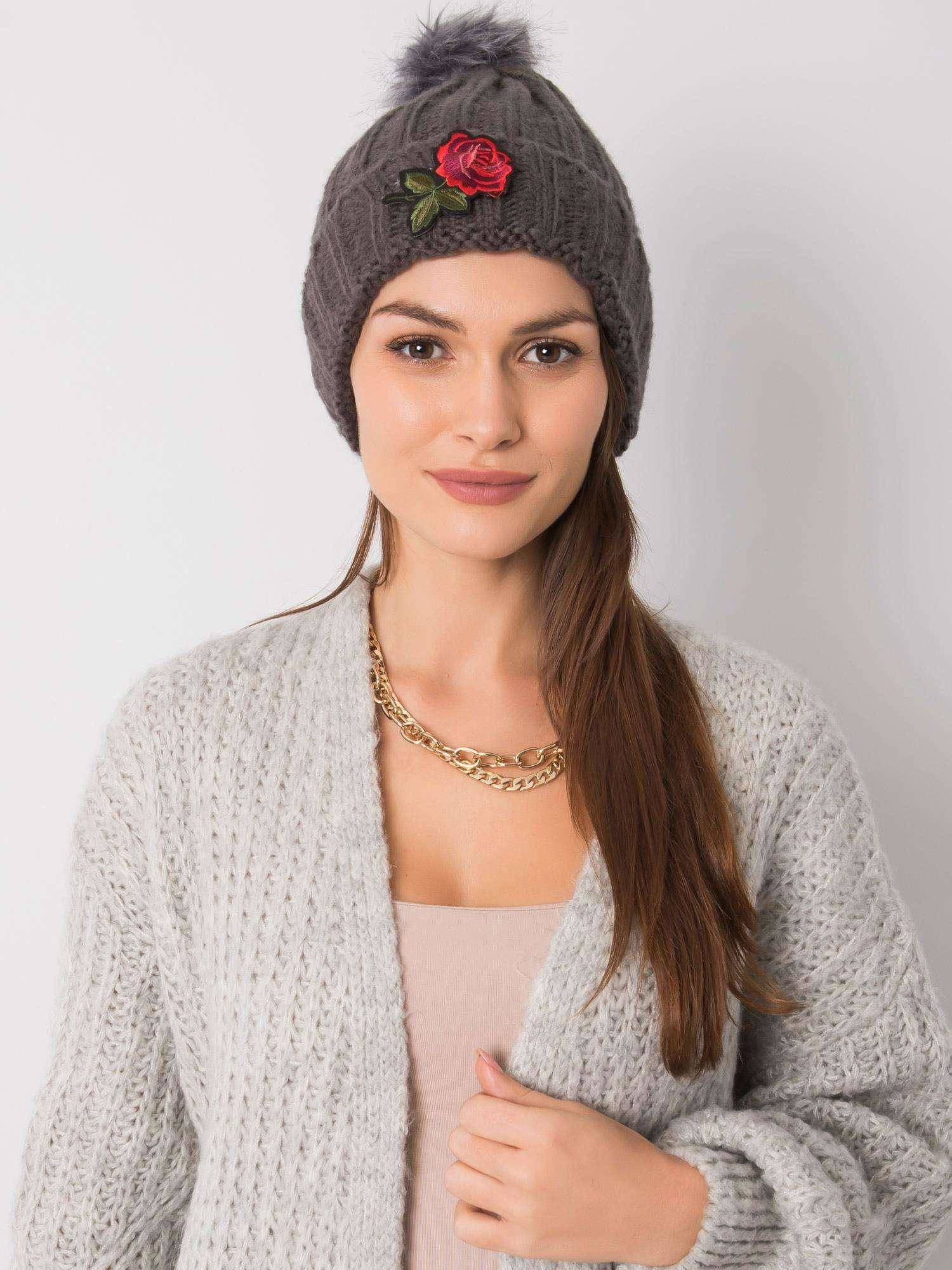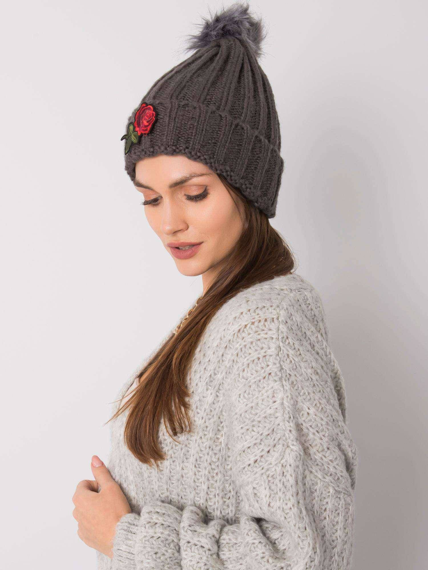 Ciepła czapka wykonana z dobrej jakości włókien. Z boku zdobiona naszywką w postaci róży. Zakończona pomponem. Model z wywijanym mankietem z przodu - można ją nosić na dwa sposoby.