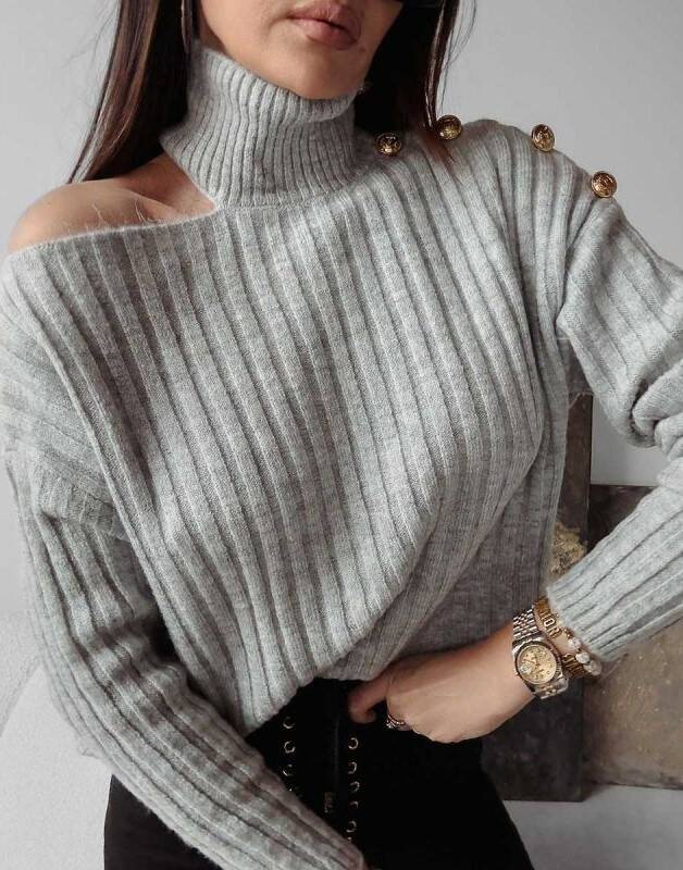 Wyjątkowy sweter o luźnym fasonie i charakterystycznym wycięciem wokół linii szyi wykonany z miękkiej dzianiny w pionowy prążek. Na ramieniu zdobiony złotymi guzikami.