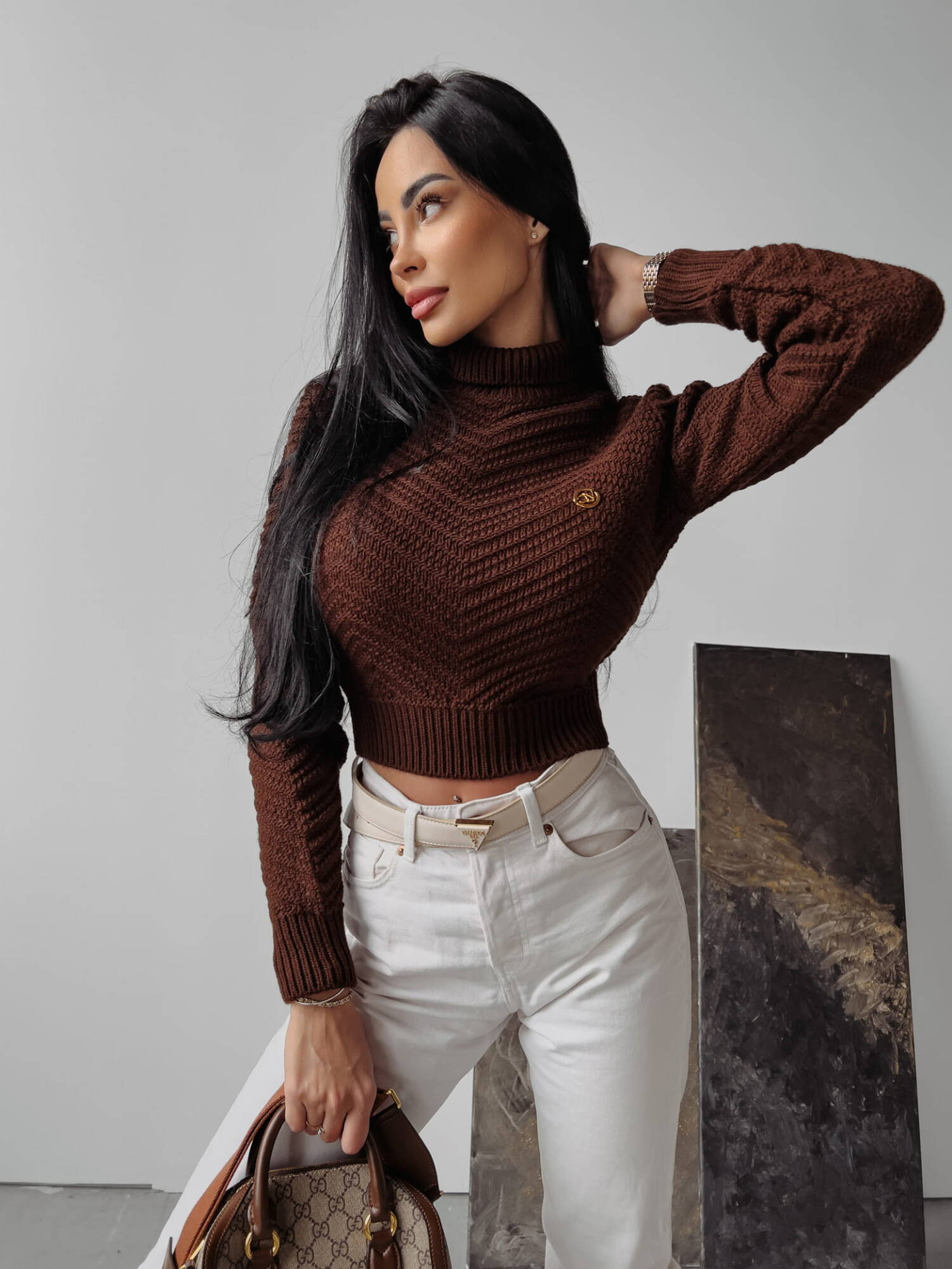 Krótki klasyczny sweter z półgolfem wykonany ściegiem w jodełkę