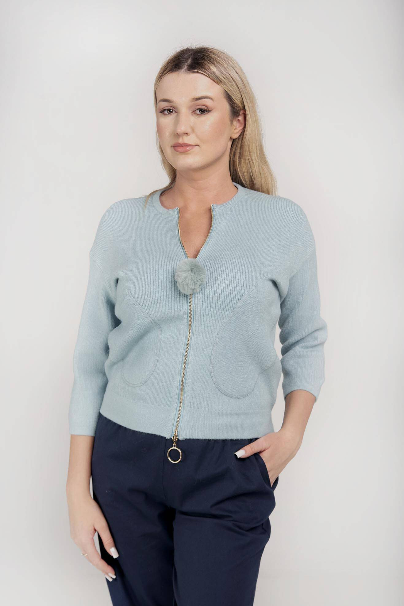 Delikatny sweter zapinany na zamek zakończony ozdobnym pomponem.