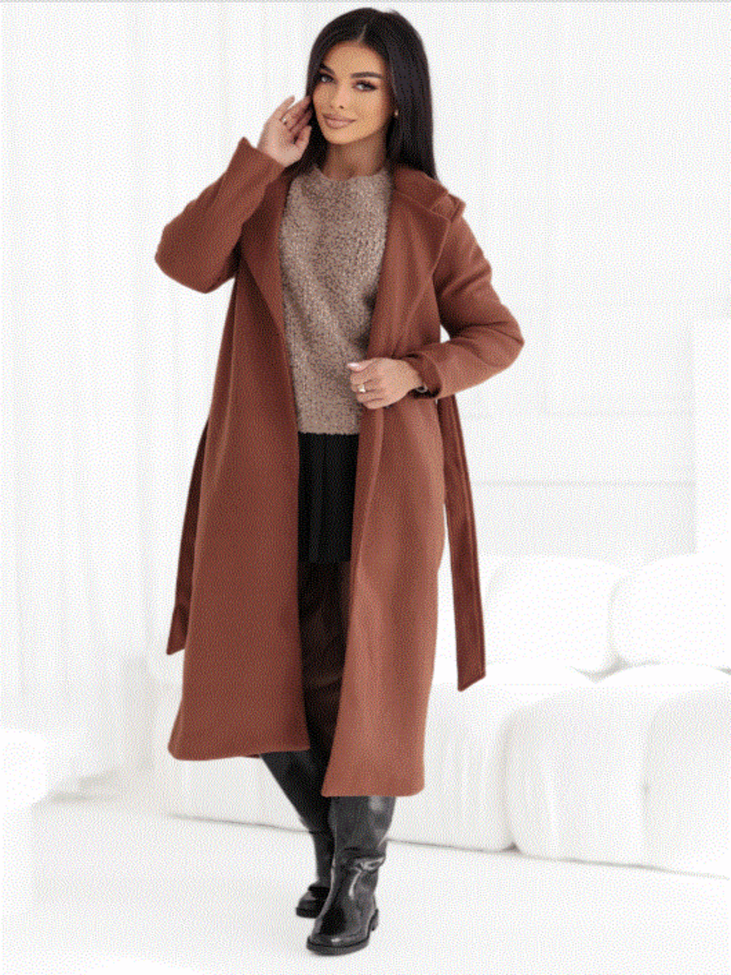 Karmelowy klasyczny długi płaszcz wiązany Och Bella