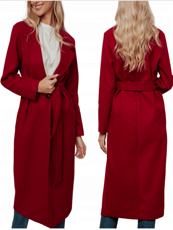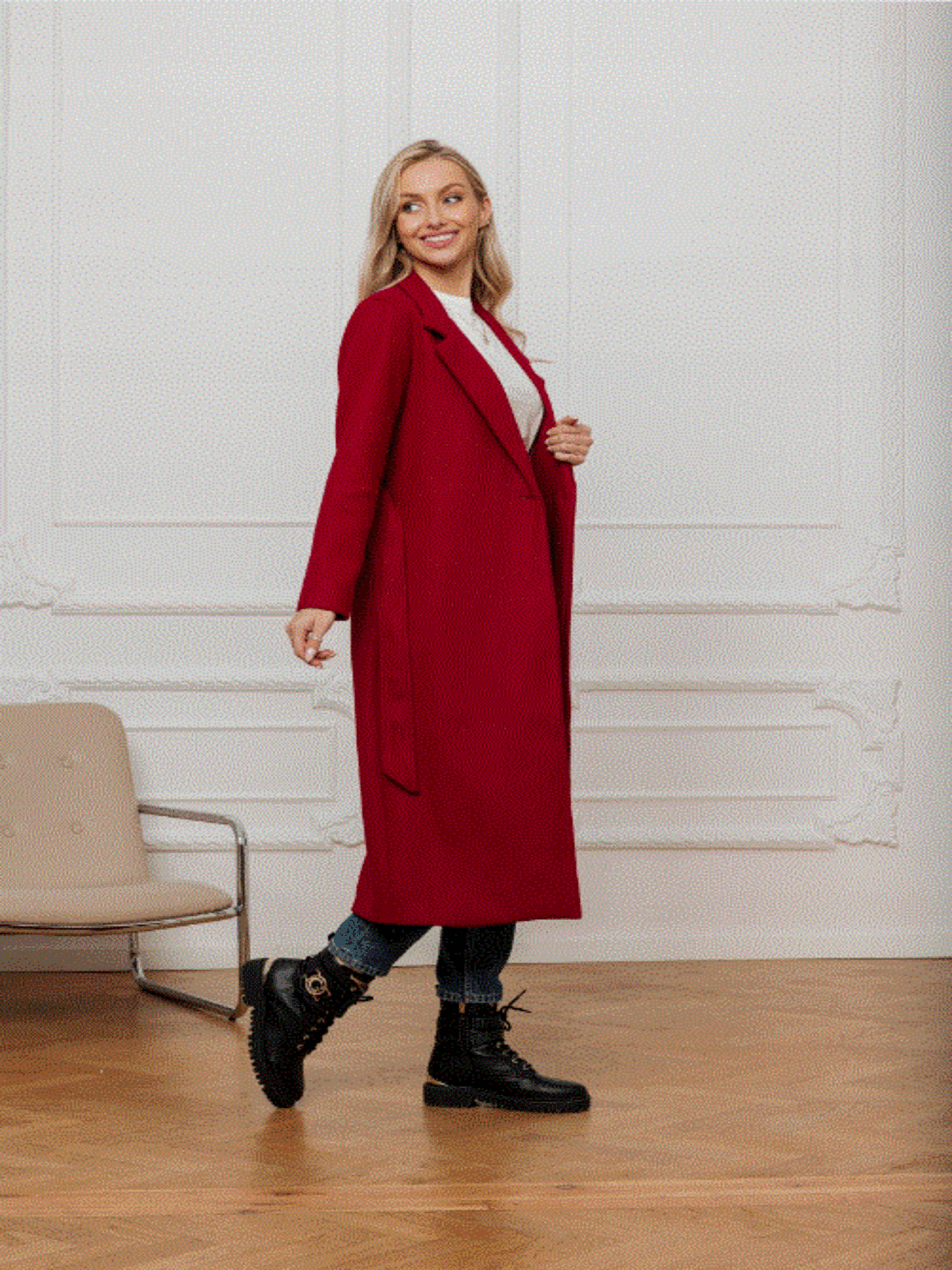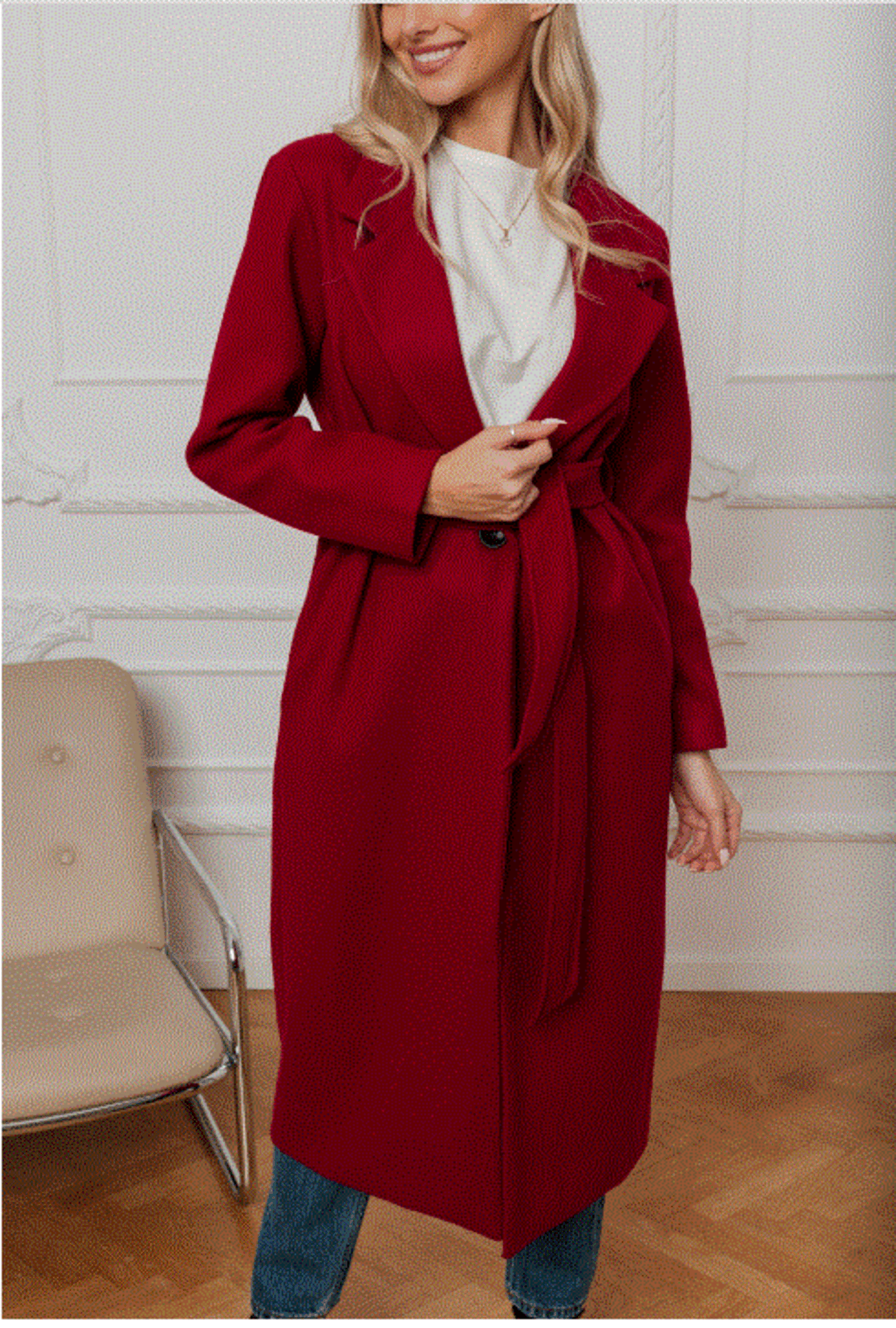 Stylowy, długi płaszcz w modnym bordowym odcieniu to idealny wybór na sezon przejściowy.