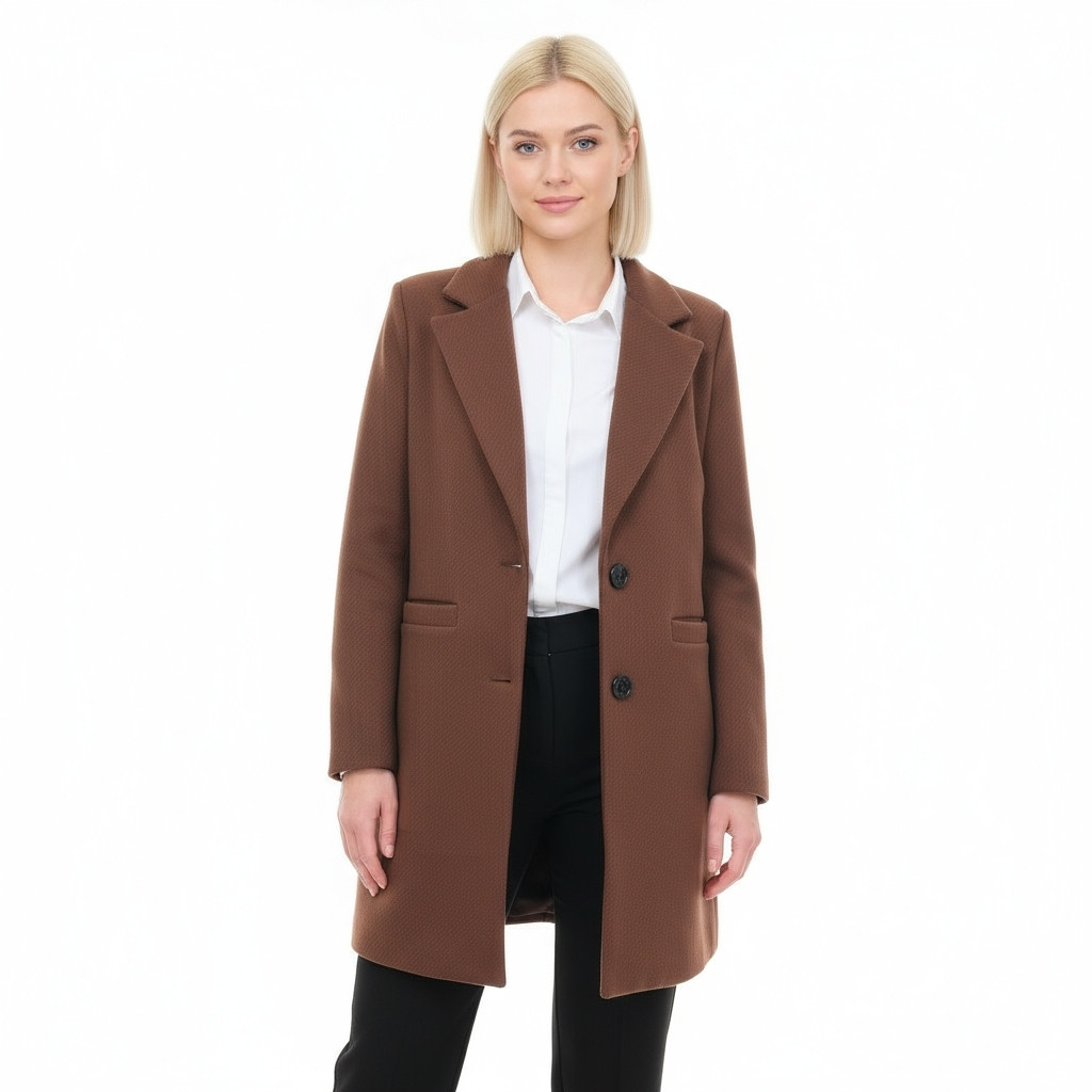 • Klasyczny, lekki płaszcz z zapięciem na dwa guziki. Faktura prążkowana.