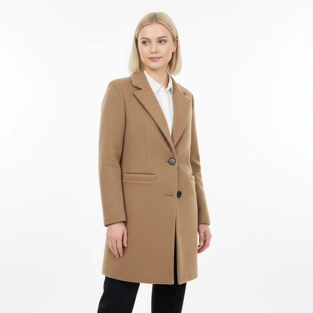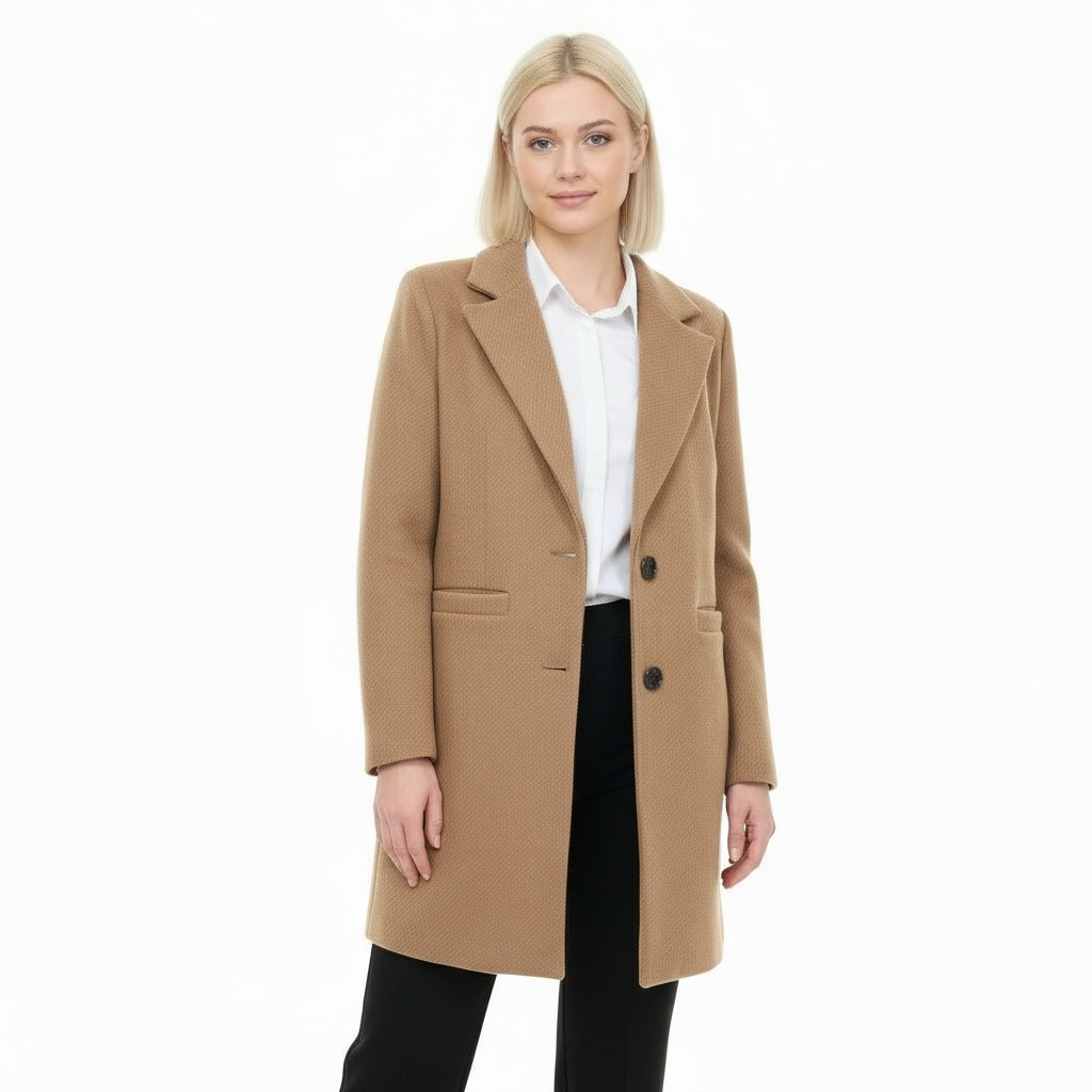• Klasyczny, lekki płaszcz z zapięciem na dwa guziki. Faktura prążkowana.