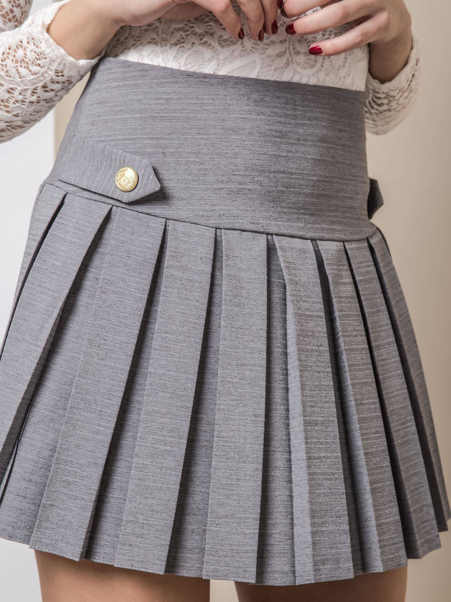 Krótka spódniczka mini z polskiej kolekcji MISS CITY. Wykonana z lekko sztywnego materiału, który ładnie się układa i jest lekko lejący. Model w kształcie litery A, rozszerzający się ku dołowi. Górna część ładnie dopasowana do sylwetki, dolna część z modnymi plisami. Po obydwu stronach, na wysokości biodrer znajdując się wstawki z ozdobnymi złotymi guzikami. Rozmiary odbiegają od standardowych, sprawdź ich dokładne wymiary w tabeli poniżej.