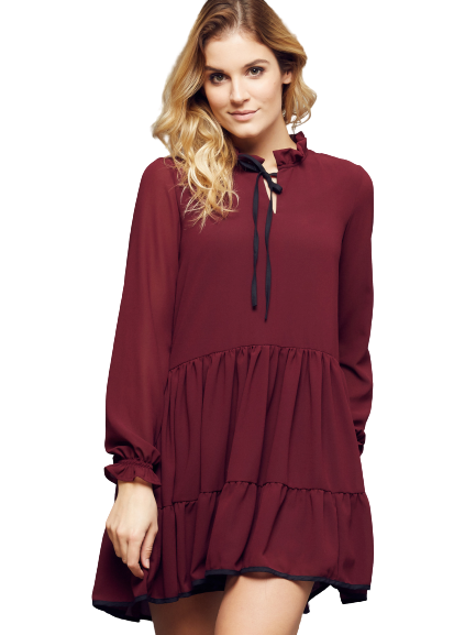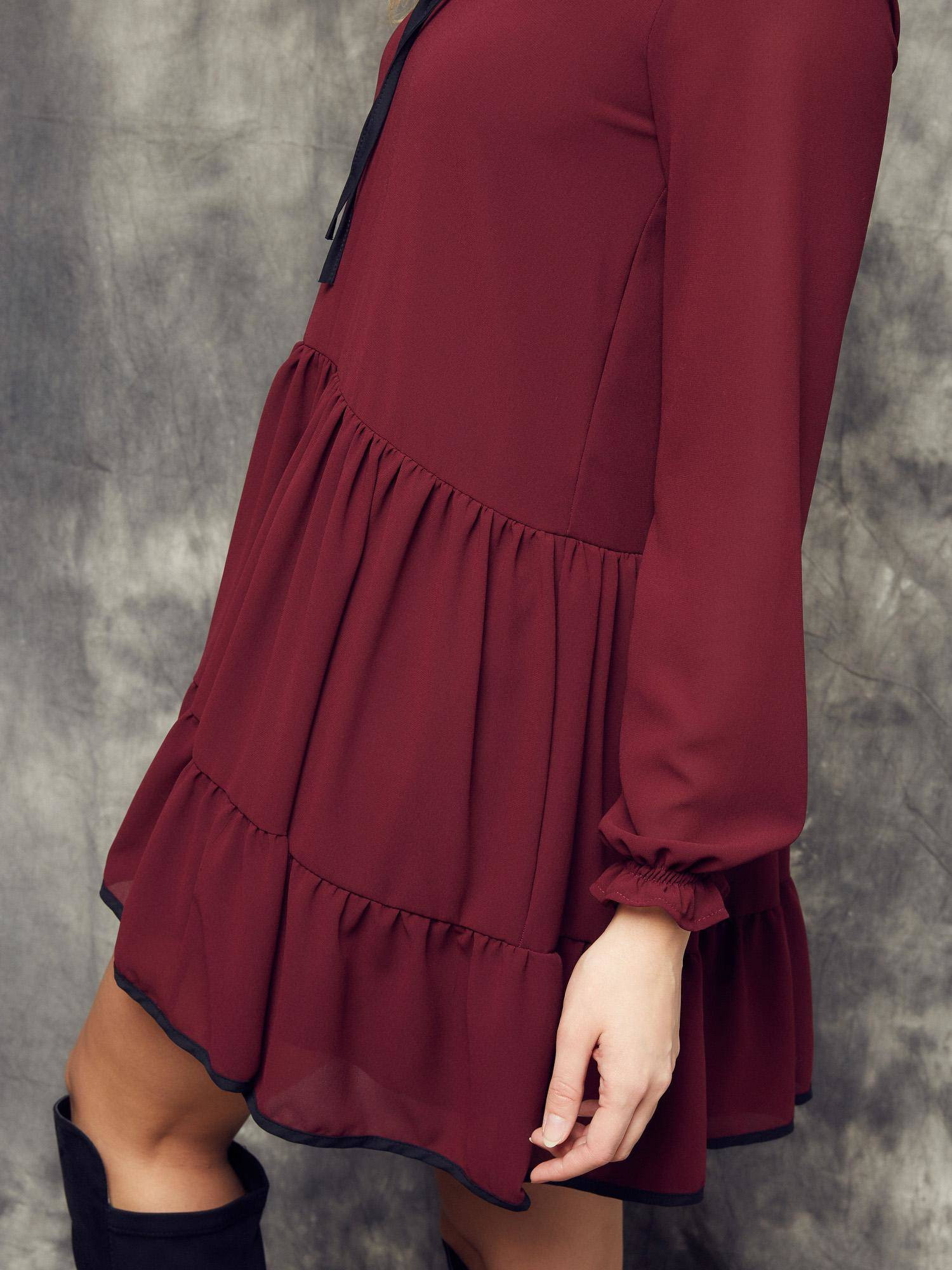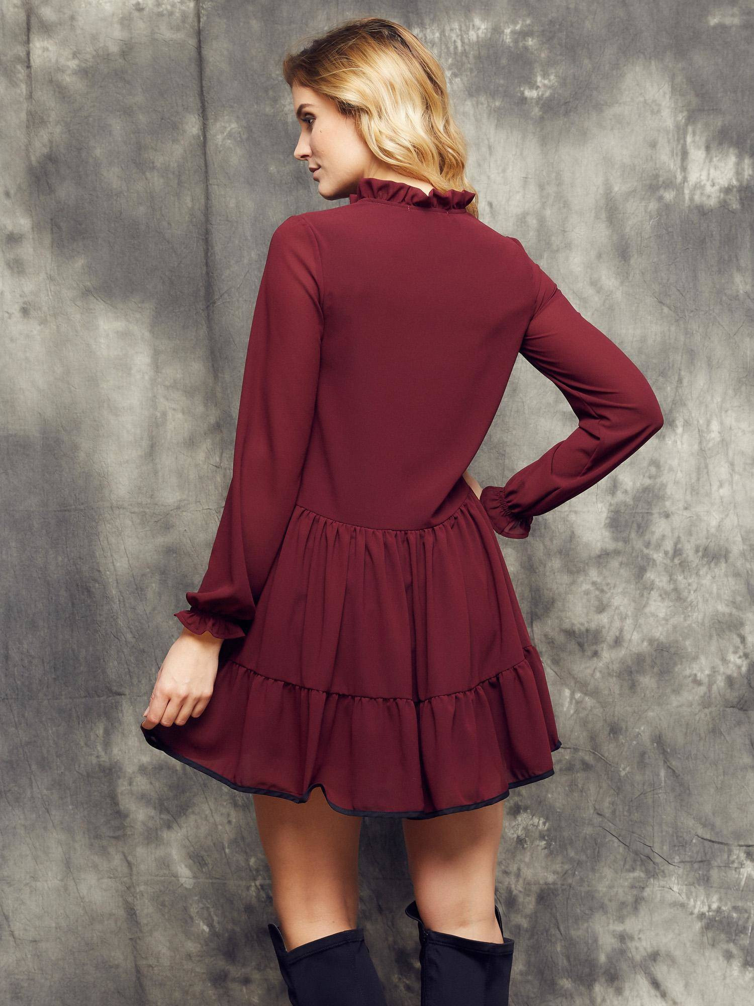 Sukienka polskiej kolekcji Cocomore Boutiqe wykonana z lekko lejącej wiskozy. Model posiada szeroką formę z dwoma falbanami. Długie rękawy zakończone gumeczką i falbanką oraz stójkę z wiązaniem. Rozmiary odbiegają od standardowych, sprawdź ich dokładne wymiary w tabeli poniżej.